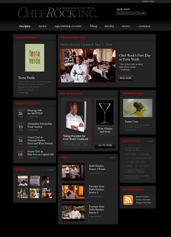 When no direction is given, it hints that I can design anything. Wait, no, that’s not the case. While I could’ve pushed boundaries with Chef Rock’s website, I often find it best to think relative. As there were many types of information to include, I took the conservative approach to come up with a newsletter-style design and integrated into WordPress.
